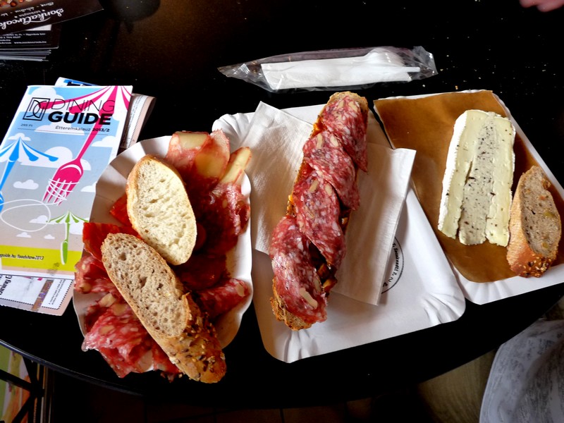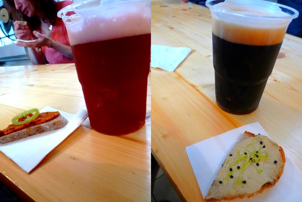 Na de elég a negatívumokból, mert azért nem erről szólt az esemény, számunkra is inkább pozitív élmény volt. Első utunk a már előre kinézett SonkaArcok standjához vezetett. Itt aztán jól be is vásároltunk az első számú ebédhez: Katalán tál, Szarvasgombás vajjal töltött brie torta, és Laskagombás bruschetta diós bodegával volt a menü. A Katalán tál szalámi variációi rendben voltak (talán a paprikás volt a legmeggyőzőbb), a brie torta kirobbanó szarvasgombás zamata és a frissen sült bruschettára halmozott szaftos raguszerűség minden pénzt megért. Azt hiszem, már tervezhetjük is látogatásunkat a Sonkaarcok főhadiszállására.