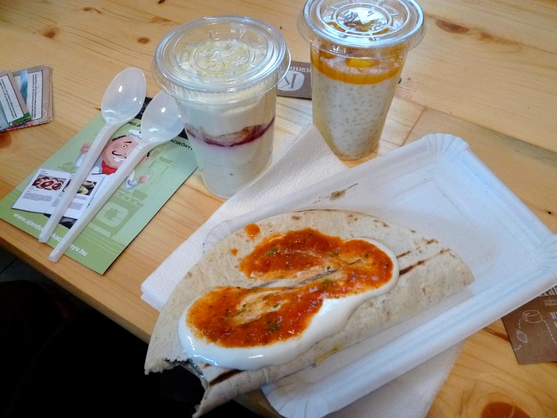 Míg én a sörök felett ücsörögtem, Lütyő új kóstolni valókat keresett. Én legszívesebben a bodega hamburgerei közül választottam volna, Ő pedig a Gyradiko görög választékát tette volna próbára, de sajnos az egyenként fél órás sort nem vártuk ki. Inkább a meglepetés beugróként (a Macesz Huszár helyén) jelenlevő “Dél-Amerikai Pop Ups” (vagy valami ilyesmi) felirat alatt szereplő egység kínálatát vettük górcső alá. A kihelyezett plakátjukból, majd a lányok elmondásából megtudhattuk, hogy ők valójában kizárólagosan cukrászdaként működnek, azaz fognak majd működni, ez a kísérletező alkalom. Ehhez képest az általuk kínált quesadilla előtt le a kalappal. Szereztünk egy-egy pohárdesszertet is kíváncsiságból. Közülük a tápitókapuding mangózselével nyert, a panna cottát kissé egyszerűnek találtuk, hangzatos elnevezése dacára (zöld teás-passion fruit-os, málnás panna cotta). Ez azért is volt jó hír, mert már régóta tervezzük a tápiókapuding különféle verzióinak itthoni kipróbálását, de bevallom, eddig még egyikünk sem kóstolta ezt a pompás desszertet. Ezek után semmi akadálya a kreatívkodásnak.