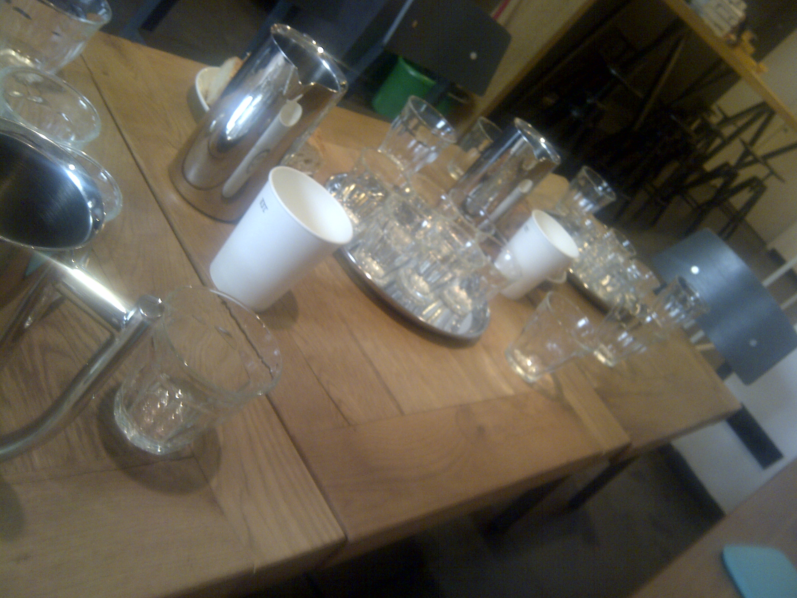 A helyszín természetesen az Espresso Embassy volt. Odaérve, meglepve tapasztaltam, hogy az ajtó el van barikádozva néhány asztallal. Értetlen toporgásomra szerencsére hamar felfigyeltek és beljebb invitáltak. Érdekes, hogy kívülről sokkal kisebbnek tűnt az egész. Belül igen tágas, ízlésesen berendezett helyiség fogadott. A bútorok egyszerűek, de praktikusak, a vízcsövekből összeállított világítási rendszer pedig határozottan ötletes. Hamar kiderült, hogy az eleve angol nyelvűre tervezett programon csak egy ember lesz, aki nem tud magyarul, így mókás volt, hogy 7 magyar egymással is angolul beszélgetett 2,5 órán keresztül. 🙂 Persze a hangulatra így sem lehetett panasz. Rajtam kívül egy bloggerből, egy Sommelierből, Egy amerikai „vendégmunkásból” és néhány foglalkozásszerűen is kávéval foglalkozó emberből állt a csapat.