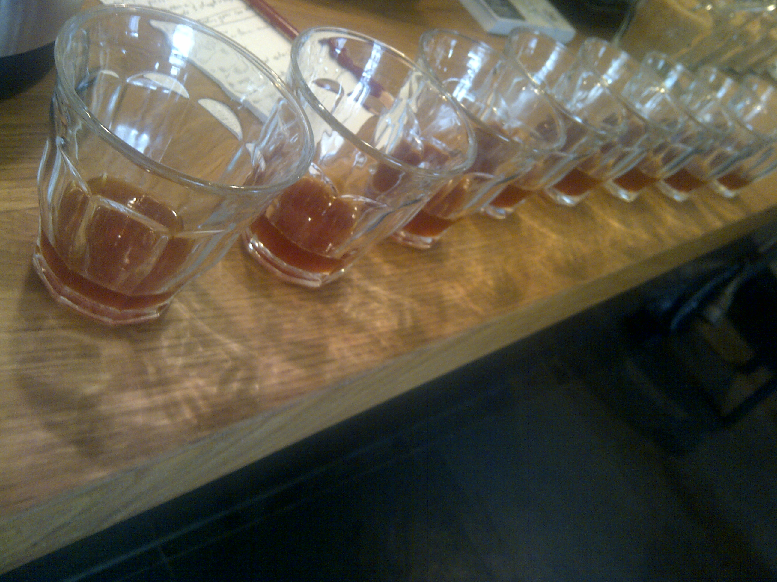 Rövid bemutatkozás és minimális elméleti áttekintés után rögtön bele is csaptunk a lecsóba, azaz megkaptuk az első két adag kávénkat, összehasonlítási célzattal. Mondanom sem kell, hogy a társaságból én voltam az egyetlen, aki semmi különbséget nem érzett a két minta közt… Mentségemre legyen mondva az egyetlen dolog, amiben a két tétel eltért egymástól az az őrlési finomság volt. És itt van a kutya elásva. Ugyan Tibor mutatott nekünk egy, a használati utasítástól eltérő fordított módszert az AeroPress-es kávékészítéshez, de a lényeg nem ez volt, hanem a próbálgatás. Hogy lássuk, mi történik, ha ugyan azokkal a paraméterekkel készítünk el két kávét és egy apróságot az egyiknél megváltoztatunk. Pl. másmilyen vizet használunk, vagy tovább hagyjuk ázni, esetleg több kávét, vagy kevesebb vizet használunk. Érdekes, hogy ilyen kis változtatások is mennyire tudják befolyásolni az eredményt. Persze valaminél egyértelmű volt, másnál pedig inkább meglepő. Mindenesetre annyira jól sikerült egy-két kreációnk, hogy nem csodálkoznék, ha valamelyik hamarosan visszaköszönne az Espresso Embassy kávélapjáról. (Nekem pl. a jeges verzió jött be leginkább, sosem gondoltam, hogy egy kávé ilyen üdítő lehet.)