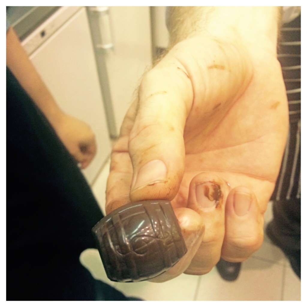 Mint azt csoki mesterünk megjegyezte, ha nincs otthon márványpult, megteszi helyette a márványlépcső, vagy rossz esetben a járólap is. Persze azért a padlófűtéssel vigyázzunk! 🙂 Ha a csokink már megfelelő hőmérsékletű, akkor egy kissé perverz elnevezésű lépés következik, mégpedig a hüvelyezés :), azaz a csoki hüvely létrehozása. Ebbe kerül majd a töltelék. Ehhez előveszünk egy bonbonformát, amire rákanalaztunk egy jó adag csokit, majd a felesleget egy glettelő spakli szerű készséggel egyszerűen lehúzzuk, majd a formát az asztalhoz ütögetve eltávolítjuk az esetleges légbuborékokat. Mikor ez elkészült, akkor a formát megfordítva kiöntjük a felesleget a formából, majd így arccal lefelé letesszük a pultra. Addig kell otthagyni, míg teljesen oda nem tapad.