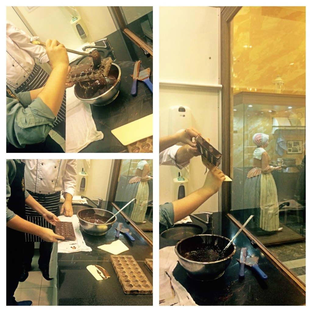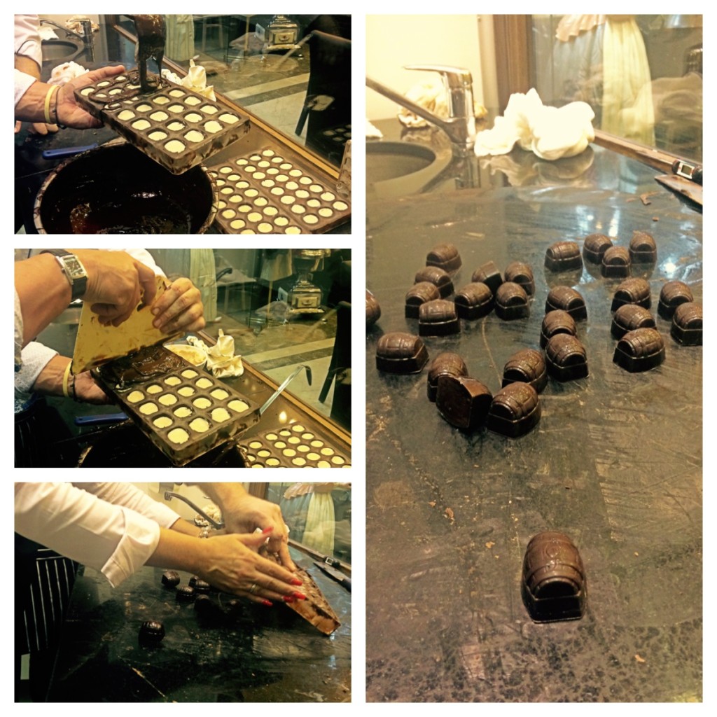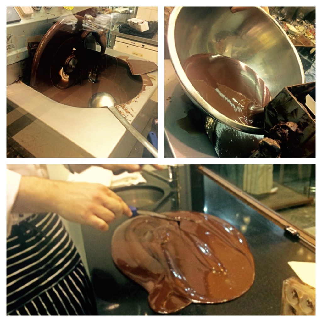 Először is vegyünk egy megfelelő méretű keverő gépet, ami megfelelő hőmérsékleten tartja és keveri az olvadt 70%-os csokoládét. Ha nem szánunk ennyi pénzt ismerőseink elkápráztatására, akkor természetesen vízfürdőben is megolvaszthatjuk a bonbonokra szánt alapanyagot. A játék pedig innen kezdődik. Ugyanis a felhasználandó masszát vissza kell hűtenünk 37-38 °C-osra, hogy a megfelelő kristályszerkezet kialakuljon. Ezt mi a márványból készült pulton való kevergetéssel értük el.