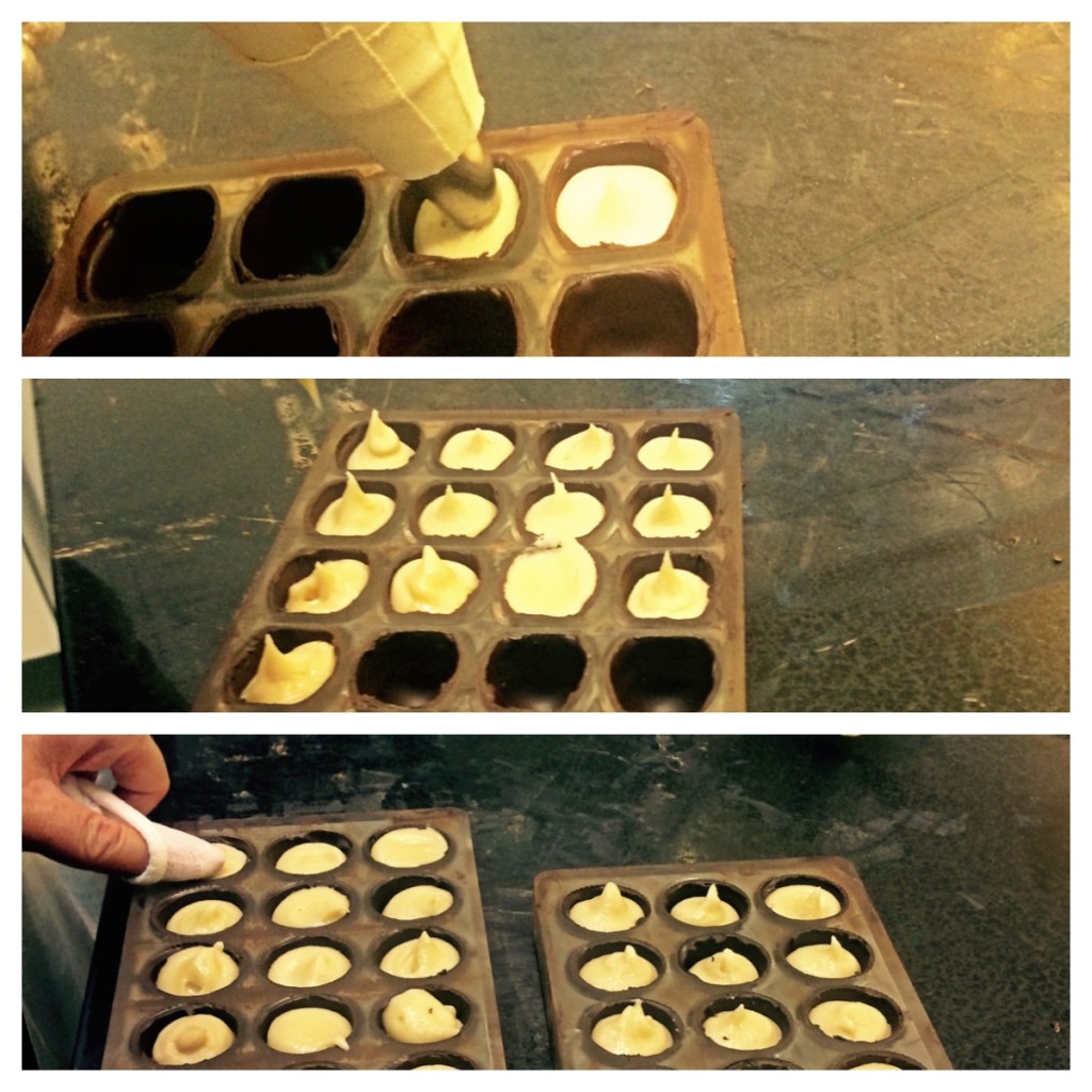 És már lehet is tölteni. Mi kétféle tölteléket használtunk: az egyik egy ganache a másik pedig egy marcipánkrém volt. Ezek már elő voltak készítve számunkra, mert ezeknek kissé össze kell érniük felhasználás előtt. A betöltés egyszerű habzsák segítségével történik. Ügyelni kell arra, hogy hüvelyek ne legyenek teljesen tele, hogy maradjon hely még a talpnak is. A kis krémcsúcsokat egy nedves rongy segítségével visszanyomkodjuk, ezt, milyen meglepő, tapizásnak hívják. 🙂