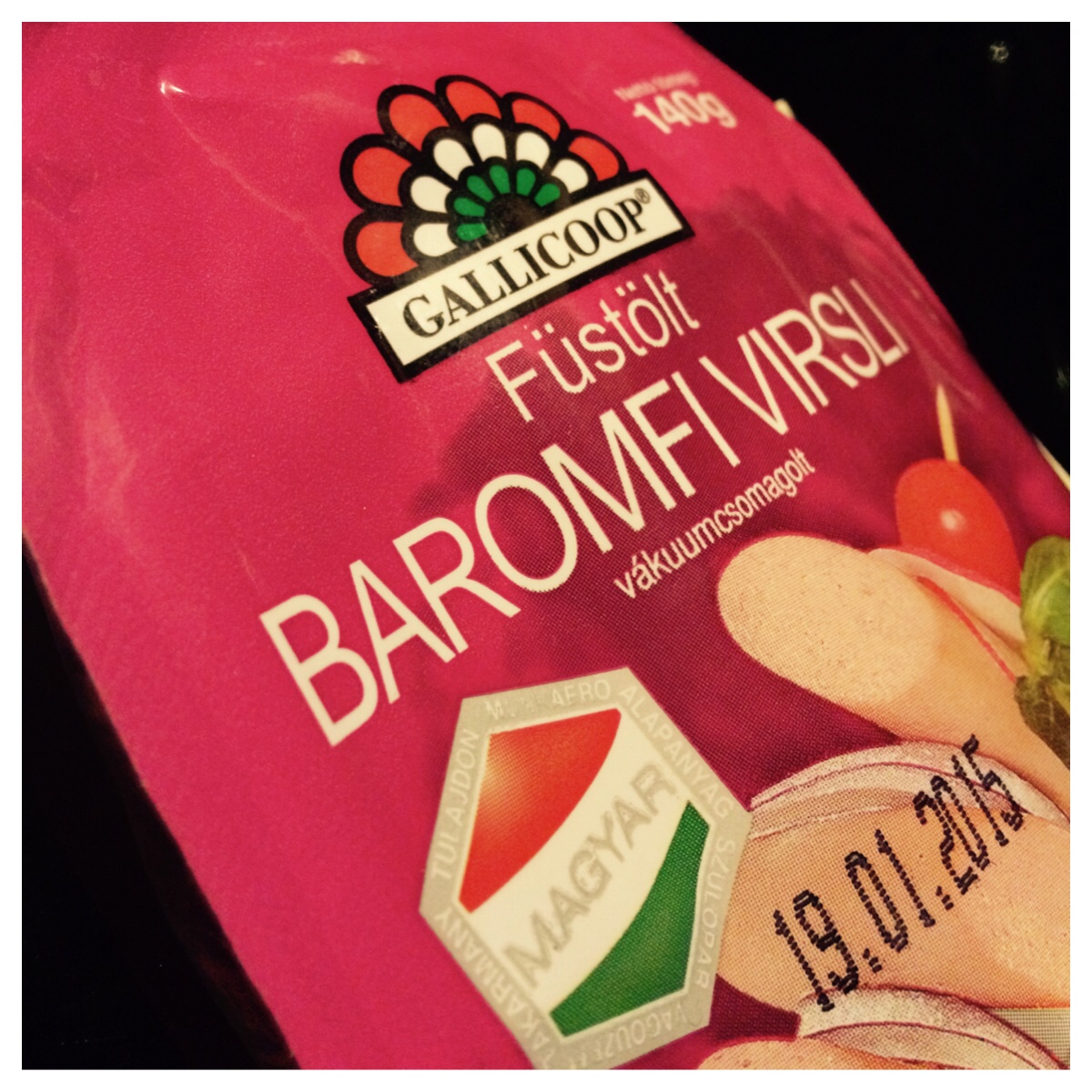 Összetevők: 68,2% baromfihús, ivóvíz, baromfibőr, sertés szalonna, szójafehérje, étkezési só, fűszerkeverék, stabilizáló keverék, füstaroma, tartósítószer.