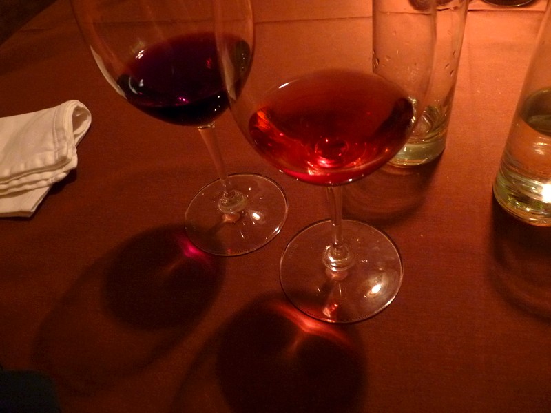 A pincér udvariasan megérdeklődte, hogy mit innánk, így hamarosan az „Étterem hét” szűkített étlapja mellett egy üveg ásványvíz és egy nem éppen puhakötésű borlap került az asztalunkra. Az étterem alatt komoly borospince található, ahol tájegységenként és évjáratonként csoportosítva, szakszerűen tárolják a kisebb lexikon méretű könyvben felsorolt nemes italokat. Persze egy ekkora méretű borlap nem csak a megkóstolható magyar és külföldi borok felsorolására szolgál. Megtalálhatóak benne a főbb hazai borvidékek többnyelvű leírásai is. Lütyő a pincér segítségét kérte a borválasztáshoz, aki készséggel ajánlott neki italt a fogásokhoz. Az első választás egy Légli Géza féle Rajnai rizlingre esett. Én magam pedig egy pohár 365 cuvée-t kértem Kiss Gábor pincészetétől.