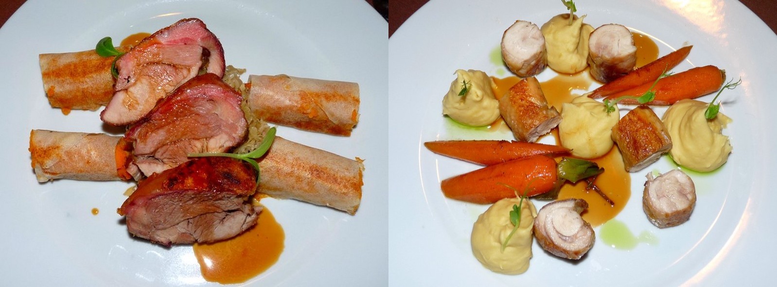 Az első nehézséggel ott szembesültünk, hogy az előétel elfogyasztása után már igencsak kezdtünk jól lakni. És még csak most jött a neheze, a választott főételeink: Sült csirkecomb csicseriborsó pürével és kakukkfüves sárgarépával, valamint konfitált malac krumplis rétessel. Lütyő pedig megkapta a második fogáshoz rendelt borát, egy szürkebarátot az Orbán pincészettől. Azt kell mondjam, hogy az erős kezdés után a folytatás is erősen sikerült. A csirkét senki ne úgy képzelje, hogy egy egész csirkecombot szórtak oda elénk. Neeeem. Filézve, felcsavarva, szép egyenletes göngyölegekre vágva, csicseriborsó püré tornyokkal övezve, egész sárgarépákkal körítve került a tányérra, páratlan vizuális és ízbeli élményt nyújtva. Természetesen a malac sem maradhatott el semmiben az előbb említettektől. A hús kellemesen omlós volt, egy pillanatra sem száraz. A hozzá kapott krumplis rétes mellé felhalmozott füstölt szalonnával párolt káposztával együtt valódi ízrobbanást okozott az ember szájában kóstolás közben. A párolt káposzta színvonaláról csak annyit, hogy Lütyő, káposztautálata ellenére 4-5 alkalommal lopott belőle a tányéromról.